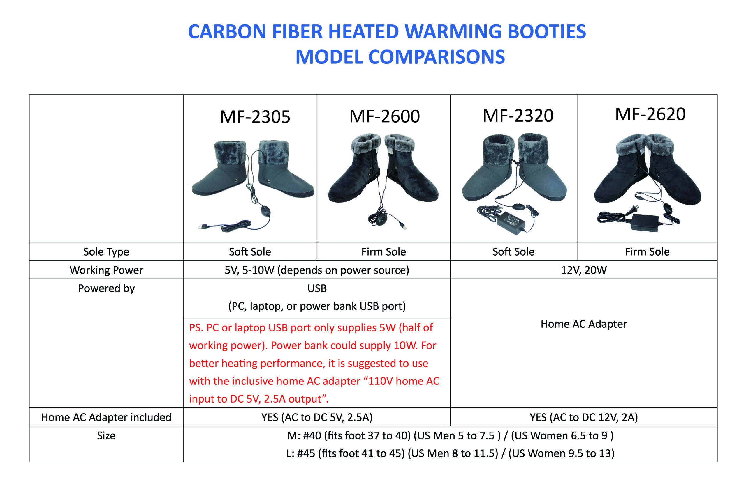 – MF-2600L : USB 5V, 10W, L: bis Schuhgröße 45